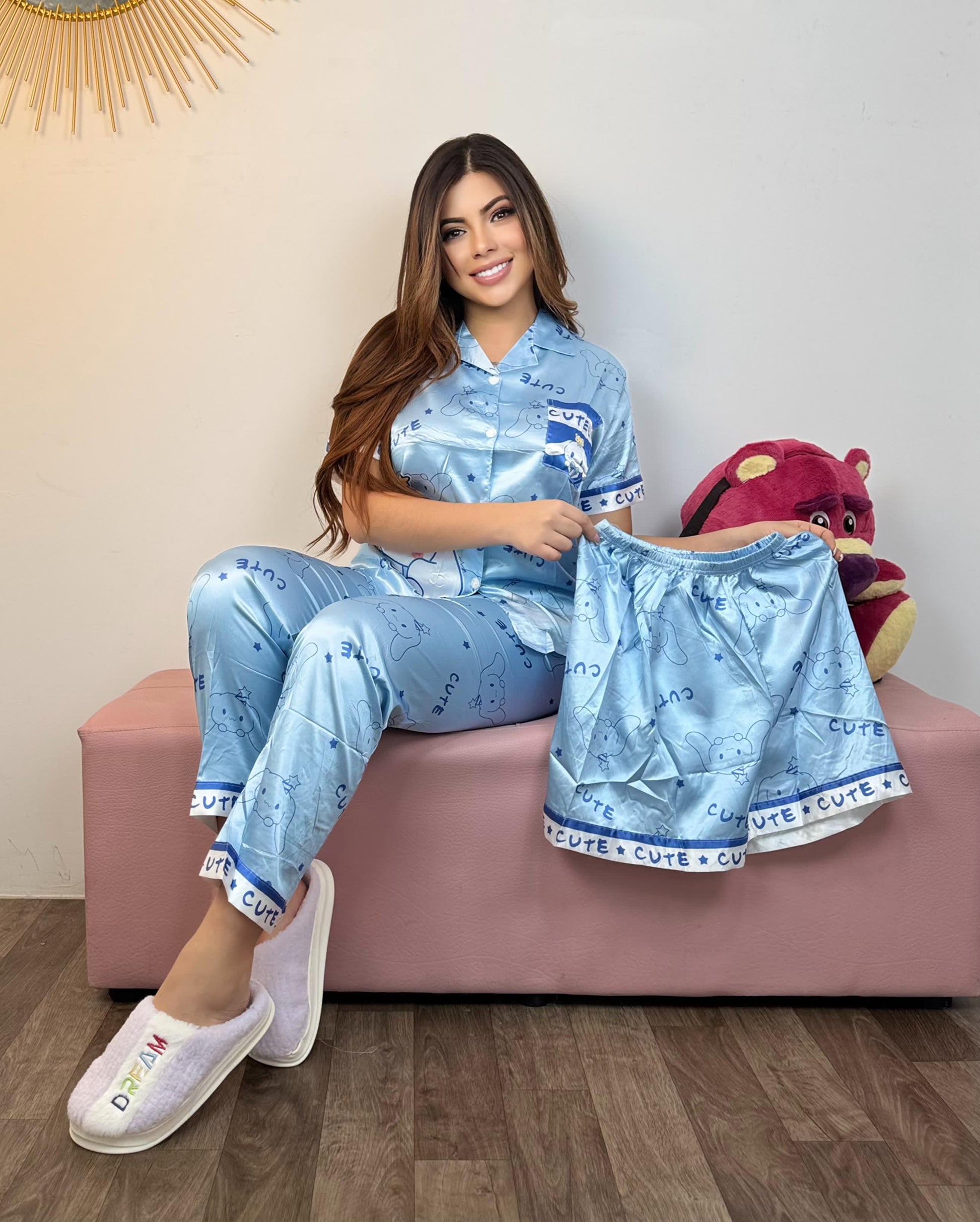 ✨ ¡Comodidad, estilo y elegancia en un solo conjunto! El 3 piezas satinado incluye blusa, short y pantalon, perfecto para sentirte linda y cómoda en casa 💕. Su tela suave al tacto y diseño femenino lo hacen ideal para descansar con glamour 🌙💫