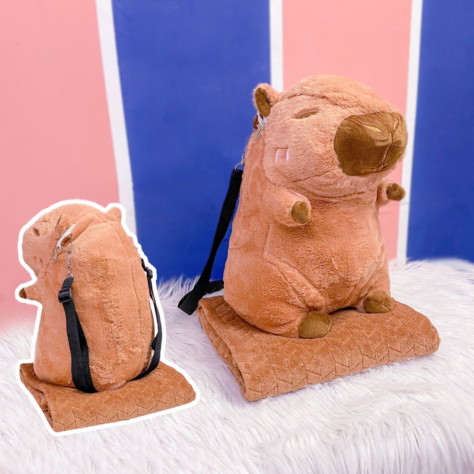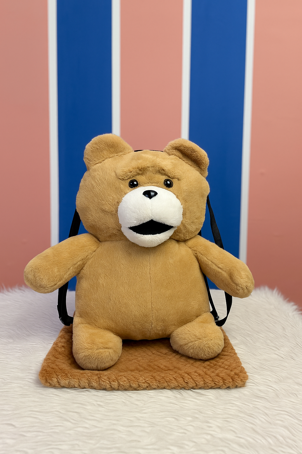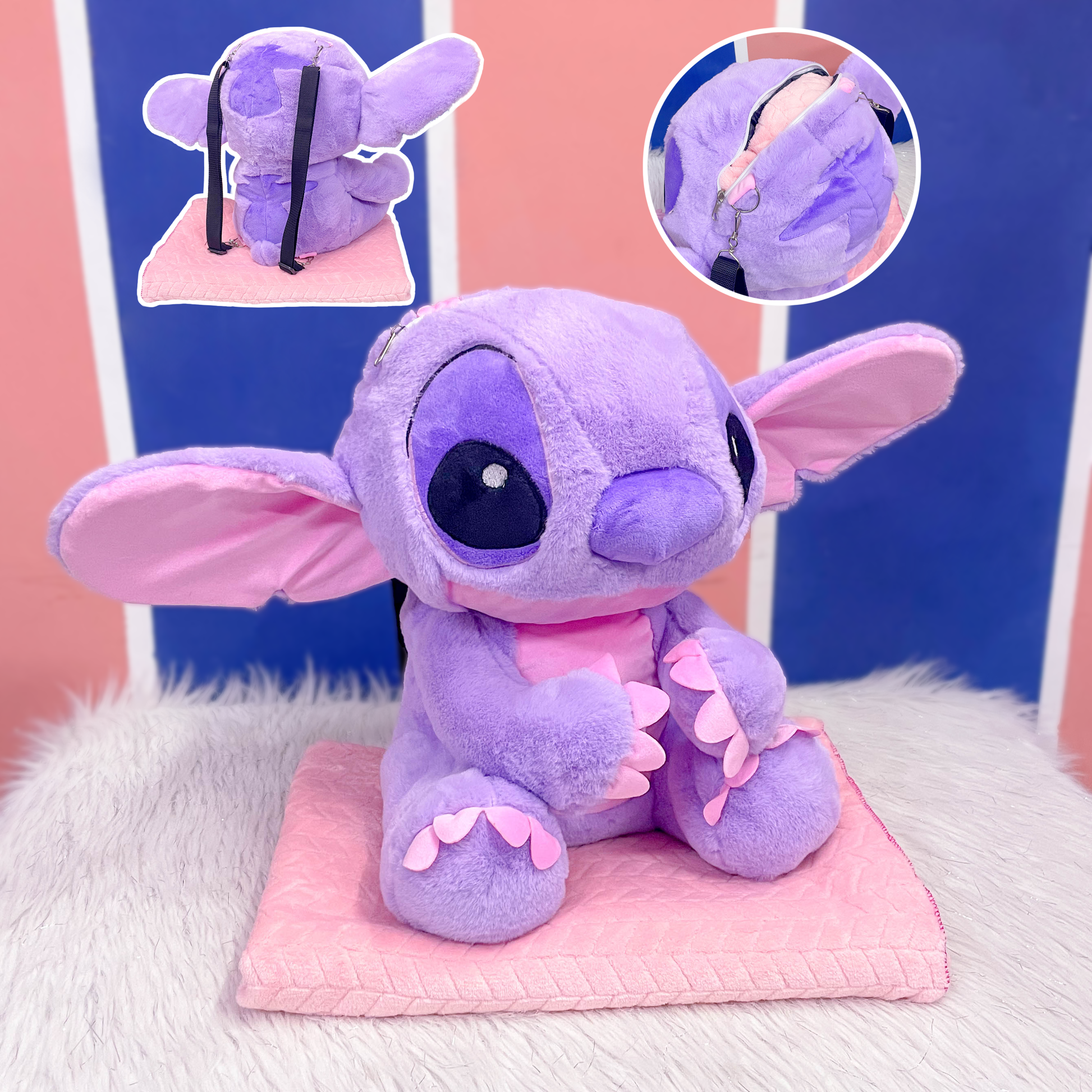 Peluche grande del personaje Lotso de "Toy Story", de color rosa intenso con detalles morados y crema, que no solo es un adorable juguete sino también un artículo multifuncional, ya que en su interior guarda una cobija con estampados del mismo personaje y, además, puede usarse como mochila gracias a sus correas traseras.Altura 38cm Ancho 35cm