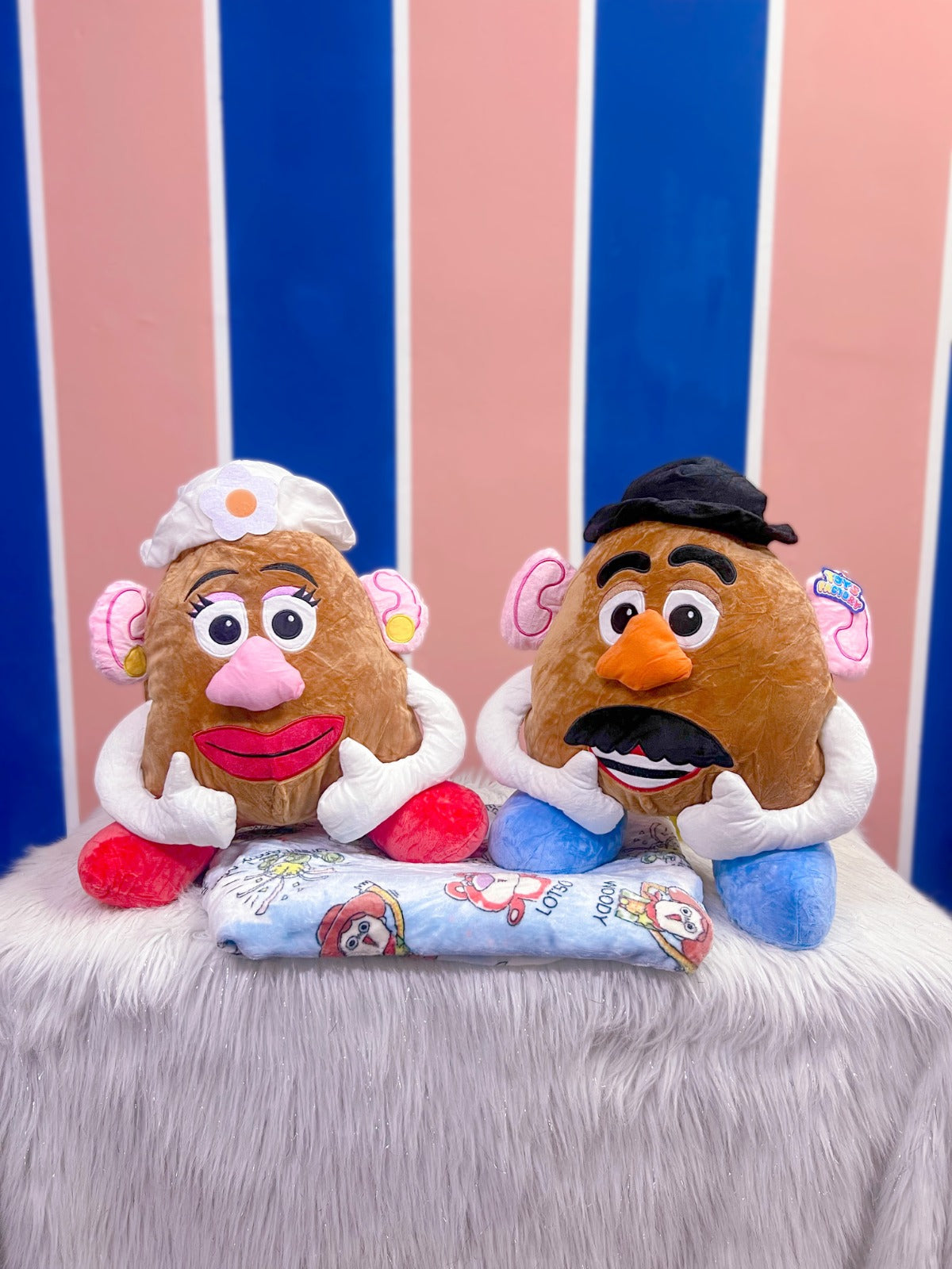 Soy la Sra. Cara de Papa y él es el Sr. Cara de Papa; somos peluches suaves. Entre nosotros, hay una cobija de "Toy Story" enrollada.